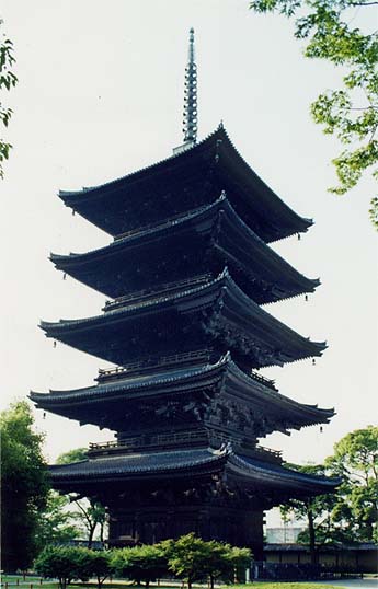 | 教王護国寺(きょうおうごこくじ)は平安京造営に際し,国家鎮護のために建立された官寺のひとつです。弘仁14年(823)には空海に下賜されて真言密教の道場となり,寺院として本格的な伽藍が整えられました。南大門,金堂,講堂,食堂,北大門が南北軸上に並び,この東南方には五重塔が,西南方には灌頂院が配されて,創建当時の伽藍配置を伝えており,平安京復元の基準としての意味をもっています。 金堂(本堂)は慶長8年(1603)に再建されたもので,桃山時代を代表する豪壮雄大な建築です。また五重塔は寛永21年(1644)の再建になるものの,復古的意匠をもち,その高さは現存する塔のなかでは最大で,京都の景観的シンボルとなっています。このほか,弘法大師の住房として建てられた大師堂は,康暦元年(1379)に焼失後翌年再建され,さらに明徳元年(1390)に大師像を拝する礼堂と廊を増築したものが現存しており,寝殿造の形式を受け継いで優美な姿をみせています。 |