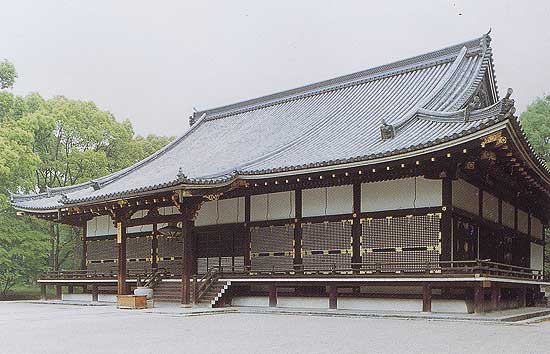 | 仁和寺(にんなじ)は,仁和4年(888)に宇多天皇により完成した勅願寺で,また皇子・皇孫が門跡を務めたことから門跡寺院の筆頭とされて,「御室御所」といわれています。 応仁の乱により全伽藍を焼失しましたが,寛永18〜正保3年(1641〜46)に再興され,このとき当時御所にあった紫宸殿と常御殿が移築されて,それぞれ金堂と仁和寺御殿(明治20年焼失)に転用されました。また清涼殿の古材を用いて御影堂が造営されたほか,ニ王門・中門・五重塔などが建てられ,境内の整備が進められました。現在みられる伽藍は,主としてこのときのものです。 金堂は,正面7間,側面5間の大規模な建物で,屋根が檜皮葺から本瓦葺へ改められているものの,蔀戸(しとみど)をめぐらせるなど桃山時代の宮殿建築の趣をよく伝えています。 |