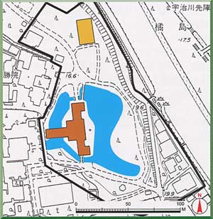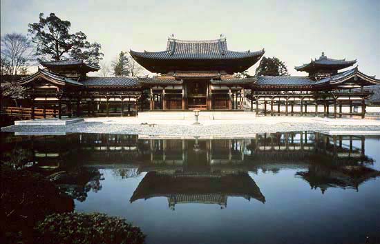 | The Byodo-in was originally one retreat, owned by Fujiwara no MIchinaga and was converted into a temple in 1052 by his son, the Kanpaku (imperial regent) Fujiwara no Yorimichi. In the following year , the Amidado (Amida Buddha hall, widely known today as the Ho-o-do (phoenix hall) was built which enshrined a statue of Amida Buddha carved by the sculptor Jocho. By the begining of the 12th century, the Hokkedo, the Godaido and other building were added. Whereas most of these were destoryed when the temple complex was put to the torch in 1336, the original Ho-o-do, the Kamakura Period reconstruction of the Kannondo (Kannon hall) and the Shoro (belfry) survive to the present day. The Ho-o-do is an airy and graceful structure comprising a central hall flanked by two wings with a corridor behind. The main roof of the central hall is ornamented at either end by a bronze figure of the phoenix-like mythological bird known as ho-o. The interior is adorned with an ornate double ciborium, hosoge designs, carved bodhisattvas and murals. In front of the Phoenix Hall lies a garden with a pond, intended to represent the Judo (Pure Land Paradise). This garden is unique in incorporating the surrounding natural scenery, and is known as the "Jodo garden". The Byodo-in garden served as the prototype for the temple garden built around a central Amida Buddha hall. |