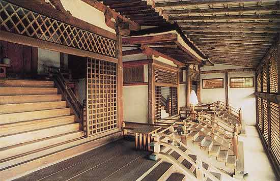 buildings were carefully maintained. The Honden is of an unusual design: it consists of three inner shrine buildings built side-by-side in the nagare-zukuri style, each measuring one day across, with a sweeping nagare-zukuri roof covering them all. Because of certain details of workmanship in the entablature, it is believed to have been constructed in the late Heian Period, and is the oldest extant Shinto main shrine building. The Haiden, built in the Kamakura Period, is older than any other extant Shinto worship halls as well. It is destinguished by its residential-style design, with the hisasi (narrow, roofed areas) appened to the right and left of the kirizuma-style moya (inner area), with the hisasi roofs forming leaning gables (sugaru hafu). In contrast to the Honden which enshrines the deity, the Haiden is intended for the use of human begins, for this reason it was built in a residential style. It is believed that this Haiden was built using the airy, buoyant techniques of the shinden-zukuri style which represented contemporary residential architecture at the time of its original construction and that those techniques were passed down in the reconstruction in the Kamakura Period. |