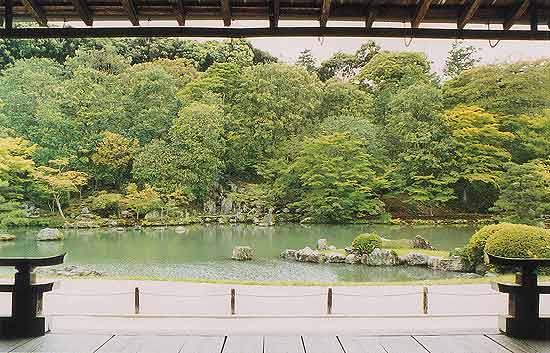 Originally built in 1255 as a detached palace with a view of Mt. Arashiyama, Tenryu-ji was converted into a Zen temple in 1339. With a typical layout coprising the Sanmon (main gate), Butsuden (Buddha hall), Hatto (lecture hall) and Hojo (abbot's quarters) arranged in a straight line, Tenryu-ji features a garden, credited to the monk Muso Soseki, which incorporates the natural topography of the hill behind the temple into the garden design. The principal temple structures burned down in military conflagrations, but the garden survives intact with the exception of additional work from the northern bank around to the eastern bank of the pond. This dynamic and sophisticated garden is built around apond with stone works forming Ryumon-baku waterfalls, stone bridges and rock islands. The emphasis on the view from the Hojo as well as its methods of arranging rock groupings exerted a significant influence on the stone works along ponnds and karesansui (dry landscape) style rock gardens developed during the MUromachi Period.