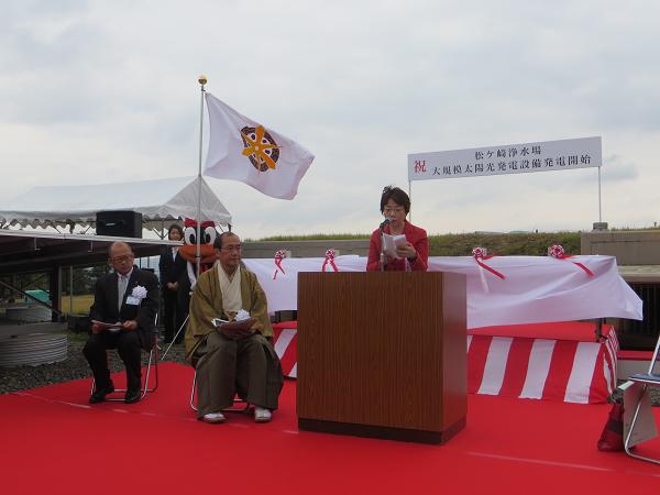 松ヶ崎浄水場配水池メガソーラー発電開始式典が開催され,副議長が出席しました。副議長は,「五山の送り火で有名な,この「妙」の地において,大規模太陽光発電設備が整備されたことは,伝統文化と最先端産業が共存する本市を象徴するものであり,今後,本施設が,新たな再生可能エネルギーの更なる普及に向けて,大きな牽引力を発揮し,市民の皆様が安心・安全に暮らすことができる,自然環境にやさしいエネルギー社会が推進されますことを,強く期待しています。」と祝辞を述べました。