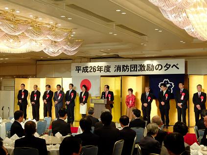 平成26年度消防団激励の夕べが開催され,議長,副議長共に出席しました。議長は,「消防団員の皆様方におかれましては,被害を最小限に食い止めるため,第一線でご活躍いただき,防災・減災に多大なるご尽力を賜り,改めて深く敬意を表し心から感謝いたします。今後とも,地域と市民を守るリーダーとして,防火・防災活動にお力添えをいただきますようお願いします。」と挨拶を述べました。