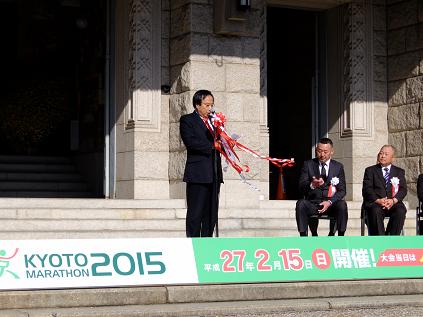 京都府産業廃棄物協会からの寄付受納式及び京都マラソン「ノーマイカーデー」告知車輌の出発式が開催され,議長が出席しました。議長は,「今回の京都マラソンは新たな魅力創出につながるコース変更が行われており,例年にも増してノーマイカーデーの周知が必要です。ご提供いただいた告知車輌で本日から周知できることは大変意義深いことであり,京都マラソンをより素晴らしい大会にするため,皆様方のご理解,ご協力を賜りますよう,今後ともよろしくお願いします。」と挨拶を述べました。
