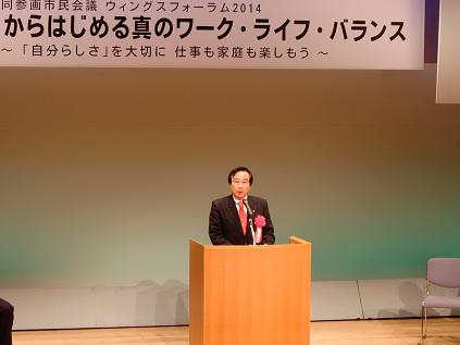 ウィングス・フォーラム2014が開催され,議長,副議長共に出席しました。議長は,「女性の自立と社会進出が進む中,男女それぞれが,仕事と家庭生活,更には地域社会でいきいきと活躍できる環境づくりを進めていくことが,大変重要になってきており,本フォーラムが開催されますことは,誠に意義深いものであると存じます。京都市会としましても,男女が共に自分らしく個性と能力を発揮できるまちづくりに向けて,なお一層の努力を重ねてまいります。」と挨拶を述べました。
