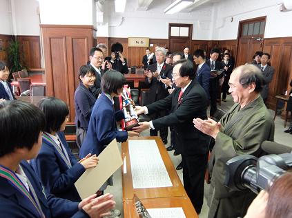 第22回全国中学校駅伝大会女子の部において優勝された京都市立桂中学校陸上部女子駅伝チームに,京都市スポーツ大賞が授与されることとなり,表彰式に議長,副議長が出席しました。