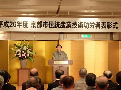 平成26年度京都市伝統産業技術功労者表彰式が開催され,議長,副議長共に出席しました。議長は,「ここ京都では,千二百年もの時の流れが育んだ,日本文化を代表する数々の優れたものづくりが伝承されてきました。それらを作り出す技術は,職人の手から手へ匠の技として受け継がれ,その時々の時代のニーズに合わせて,絶えず新たなものを創り出し,人々の暮らしを豊かにしてまいりました。皆様方におかれましては,その優れた技術の伝承と発展,更には次の世代を担う後継者の指導育成のために,今後とも一層ご活躍いただきますようお願い申し上げます。」と挨拶を述べました。