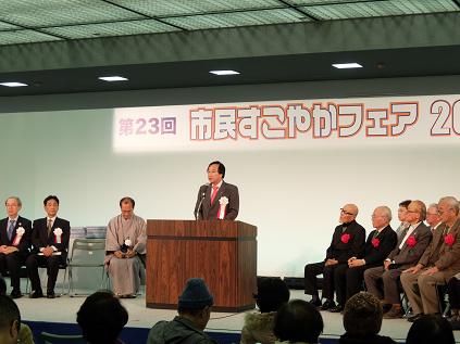 第23回市民すこやかフェア2014表彰式が開催され,議長が出席しました。議長は,「高齢化社会が急速に進行する中,高齢者の健康増進や社会参加の促進,生きがいづくりなど,活力ある長寿社会の実現のための施策は,より一層重要性を増してきております。今年度は,「京都やんちゃフェスタ」,「エコまちフェスタ」と同時開催されることとなり,子どもから高齢者の方まで幅広い年齢層の方々にご参加いただいており,皆様方がそれぞれの会場に足を運ばれ,違う世代の方々と接することにより,各世代の方々がお互いに良い刺激を受け合い,「高齢化社会のこと」,「環境に良いまちづくりのこと」,「子どもを健やかに育てる社会のこと」について考えていただくきっかけとなることを期待しております。」と挨拶を述べました。