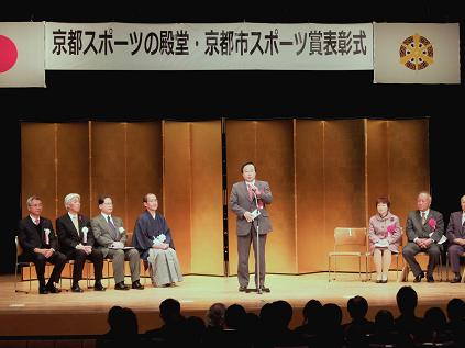 「京都スポーツの殿堂」及び「京都市スポーツ賞」表彰式が開催され,議長,副議長共に出席しました。議長は,「今日,スポーツは,競技スポーツのみならず,暮らしの中の楽しみ,青少年の教育,人との交流や健康の維持増進など,人々にとってなくてはならないものとなっています。今後とも,スポーツの楽しさ,素晴らしさ,又は難しさなどを多くの皆様に伝えていただき,スポーツの普及・発展と,市民スポーツの振興にお力添えをいただきますようお願いします。」と祝辞を述べました。