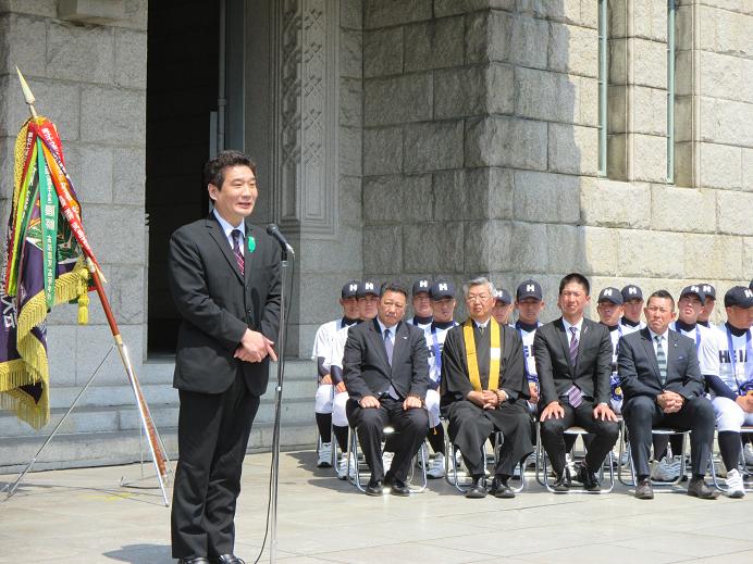 龍谷大学付属平安高等学校硬式野球部「京都市スポーツ賞」表彰式(市役所前広場)(橋村議長,隠塚副議長出席)