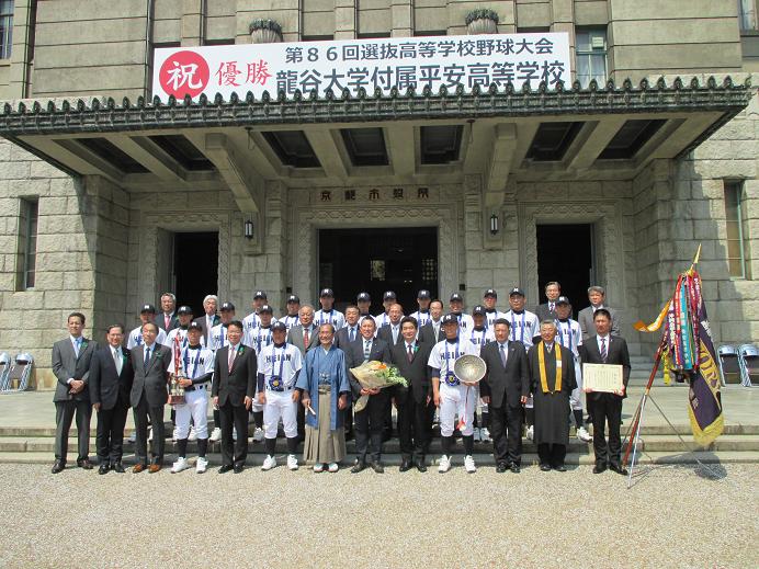 第86回選抜高等学校野球大会で優勝した龍谷大学付属平安高等学校硬式野球部に対する「京都市スポーツ賞」の表彰式が開催され,議長,副議長共に出席しました。議長は,「春夏連覇を目指し,より切磋琢磨され,もう一度感動を味わわせていただき,この素晴らしい経験を人生の糧として,今後ますますご活躍されますことを期待いたしております。」と祝辞を述べました。
