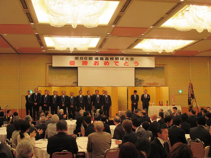 第86回選抜高等学校野球大会で優勝した龍谷大学付属平安高等学校硬式野球部の優勝祝賀会に議長が出席しました。硬式野球部の原田監督や各選手からは,春夏連覇に向けた強い意気込みが聞かれました。