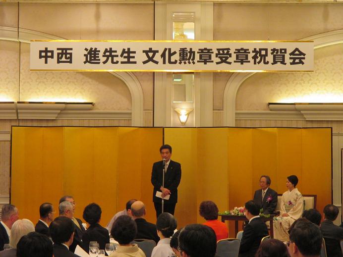 昨年,文化勲章を受章された中西進先生の文化勲章受章祝賀会が開催され,議長,副議長が出席しました。議長は,「中西先生におかれましては,現在も様々な形で京都に関わっていただいておりますが,今後も引き続き,先生の知見を京都でご活用いただき,お力添えをいただければと存じます。」と祝辞を述べました。