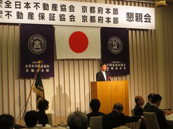 公益社団法人全日本不動産協会京都府本部・公益社団法人不動産保証協会京都府本部懇親会が開催され,副議長が出席しました。副議長は,「両協会京都本部の皆様方には,不動産市場の更なる活性化と消費者の皆様がより安心して不動産取引ができる環境づくりのために,引き続きご研鑽いただくとともに,住まいの提供等を通して,京都のまちの更なる発展のために,ご尽力いただくことを心からご期待申し上げます。」と祝辞を述べました。