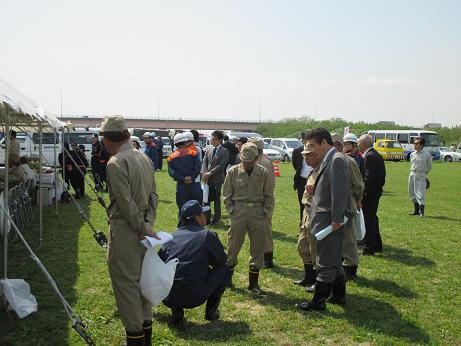 澱川右岸,桂川・小畑川水防事務組合水防訓練(淀川大橋下流河川敷)(橋村議長,隠塚副議長出席)