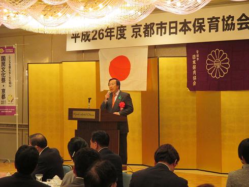 平成26年度京都市日本保育協会懇親会が開催され,議長が出席しました。議長は,「保育園の運営に関する幅広い支援活動を通じて,京都の子育てを支えてこられた京都市日本保育協会の皆様方に寄せられる期待は,今後ますます大きくなってゆくものと確信しています。」と祝辞を述べました。