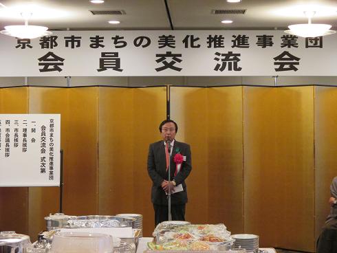 京都市まちの美化推進事業団会員交流会が開催され,議長が出席しました。議長は,「貴事業団における様々なご活動は,今後も,数多くの世界遺産を有するまち・京都の美化と,市民の皆様方の美化意識の高揚に大きな役割を果たされ,「世界一美しいまち・京都」の実現への大きな力となるものと確信しております。」と祝辞を述べました。
