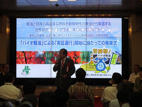 バイオ軽油走行実験セレモニーがゼスト御池で開催され,議長,副議長ともに出席しました。議長は,「今回の実証実験で使用する第二世代のバイオディーゼル燃料は,バスやトラックなどの交通インフラの血液とも言うべき重要な燃料である軽油と同等の品質を持つ新燃料です。今回の実証実験が成功裏に完了することを期待しています。」と挨拶を述べました。