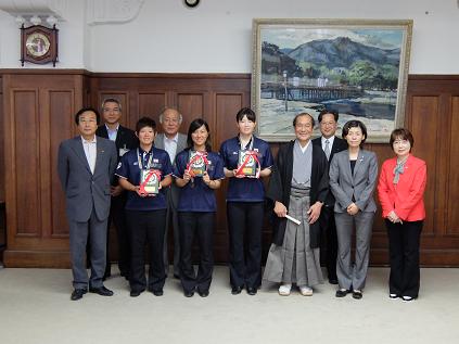 「第6回IBAF女子野球ワールドカッフ゜2014宮崎大会」に日本代表として出場し優勝を飾った,女子プロ野球チーム「フローラ」所属の3選手が優勝報告に来られ,議長,副議長共に出席しました。