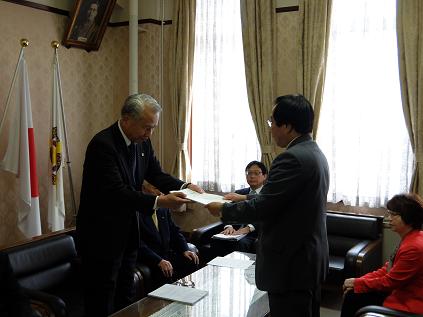 京都市農業委員会が,農業委員会制度・組織改革に関する要望を議長に提出するために訪問され,議長が要望書を受領しました。