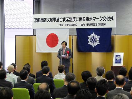 平成26年度京都市防火基準適合表示制度に係る表示マーク一斉交付式が開催され,議長,副議長ともに出席しました。議長は,「これだけ多くの皆様が防火基準適合表示マークの交付を受けられるということは,観光都市・京都の議長として,大変心強く感じるところです。今後とも,魅力ある観光都市・京都の推進にお力添えいただきますようお願い申し上げます。」と祝辞を述べました。