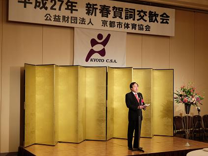 平成27年京都市体育協会新春賀詞交歓会が開催され,議長,副議長共に出席しました。議長は「今日,スポーツは,競技スポーツのみならず,暮らしの中の楽しみ,青少年の教育,人との交流を促し健康を維持増進するもの,更には生きがいなど,人々にとってなくてはならないものとなっています。このような中,皆様方におかれましては,スポーツに参加しやすい環境づくりのために,多彩なスポーツ事業を積極的に展開していただいております。今後とも,大きなお力添えをいただきますようお願いします。」と祝辞を述べました。