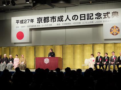 平成27年京都市成人の日記念式典が開催され,議長,副議長共に出席しました。議長は「新成人になられたこれからは,皆様は一人の独立した社会人として,社会に対して大きな義務と責任が生じます。京都のまちづくりについても,自分の目でしっかり見定め,行動することが重要です。まずは興味のある分野からでも,自分のまちを知ることから始め,京都市,京都市会の活動を見てください。」と祝辞を述べました。