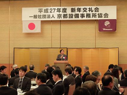 京都設備事務所協会平成27年新年交礼会が開催され,議長が出席しました。議長は「公共事業分野におきましては,学校などをはじめとする公共建築物や道路・橋りょうなどの老朽化の問題が顕在化し,長寿命化やアセットマネジメントなどの取組が進められております。本取組が着実に推進し,その影響が民間施設へ広がっていくためにも,皆様方が果たされる役割は,ますます重要なものになってきております。今後とも,安全で快適な都市環境整備の推進のため,大きなお力添えをいただきますようお願いします。」と祝辞を述べました。
