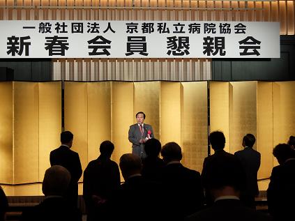京都私立病院協会新春会員懇親会が開催され,議長が出席しました。議長は「近年,急速な高齢化の進行に伴い,国民の医療ニーズは増加の一途をたどる一方,医師・看護師や救急医療体制の整備の不足など,医療を取り巻く環境は非常に厳しくなってきております。このような中,皆様方に寄せられる期待は,ますます大きくなってきています。市民の生命と健康を守るため,さらによりよい地域医療のために,大きなお力添えをいただきますようお願いします。」と祝辞を述べました。