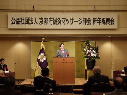 公益社団法人京都府鍼灸マッサージ師会新年祝賀会が開催され,議長が出席しました。議長は「近年,ライフスタイルの急激な変化に伴い,生活習慣病やストレスによる精神的・肉体的疲労など,様々な疾患に悩む人が増え,医療ニーズも多様化してきています。このような中,鍼灸マッサージは,肩こりや腰痛だけでなく,内臓疾患や神経疾患にも効果があると認められるなど,現代医学における重要性が再認識されているところです。今後とも,市民の方々の健康の維持増進に寄与していただきますことを期待します。」と祝辞を述べました。