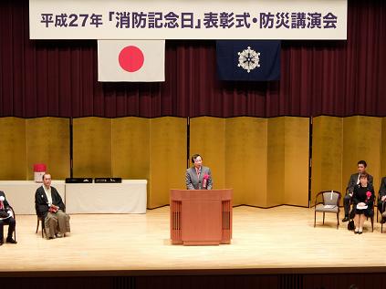平成27年「消防記念日」表彰式が開催され,議長,副議長ともに出席しました。議長は,「近年,毎年のように,全国各地で大規模災害が発生しており,皆さんの関心も大変大きくなっております。このような中,日頃から献身的に防災活動に取り組んでいただき,改めて感謝の意を表する次第です。今後とも,「自分たちのまちは自分たちで守る」という高い志の下,地域と市民の皆さんを守るリーダーとして,京都市の防火・防災活動に大きなお力添えをいただきますようお願いします。」と祝辞を述べました。