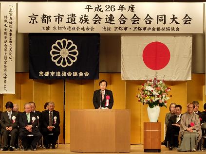 京都市遺族会連合会合同大会が開催され,議長が出席しました。議長は,「今日の平和は,先の大戦で尊い命を捧げられた戦没者の方々の犠牲の上に打ち立てられたものであることを,私たちは決して忘れてはなりません。戦争の悲惨さを語り継ぎ,命の大切さ・平和の尊さを日本中,世界中に発信していくことが今を生きる私たちの責務であると強く思うところです。」と祝辞を述べました。