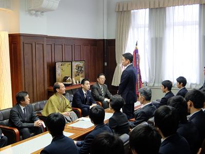 全国高校サッカー選手権,全日本女子バレーボール高校選手権大会に出場する京都橘高校が京都市役所を表敬訪問され,議長,副議長共に出席しました。