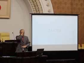 平成28年度第1回議員研修が開催され,議長,副議長をはじめ,議員全員が出席しました。国宝や重要文化財の補修を手掛ける小西美術工藝社代表取締役社長で,京都国際観光大使としても御活躍されているデービッド・アトキンソン氏から,「文化首都・京都の発展」をテーマとした講演が行われました。