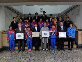 第24回全国中学校駅伝大会女子の部で優勝(3連覇)された京都市立桂中学校陸上部女子駅伝チームへの京都市スポーツ大賞表彰式が開催され,議長,副議長共に出席しました。