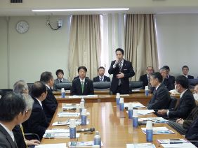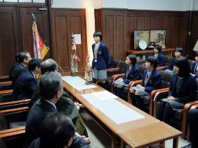 岡山市議会の議会運営委員会の皆様が,議会運営等の調査のため京都市会を訪問され,議長が挨拶しました。