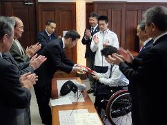 併せて,「IWAS車いすフェンシングワールドカップエゲル大会」女子エペ個人部門において銀メダルを獲得された櫻井杏理選手への京都市スポーツ大賞表彰式も開催されました。
