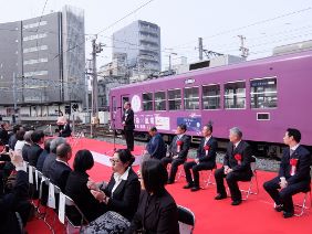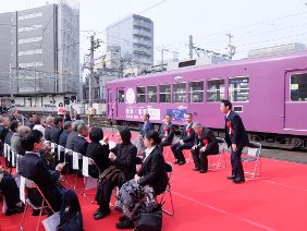 京福西院駅嵐山方面行きホーム及び阪急西院駅新改札口完成記念式典(京福西院車庫内)(津田議長出席)