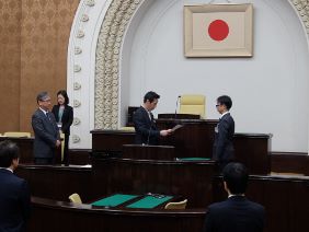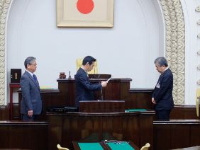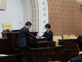 平成28年10月31日から11月8日の間,デンマークにおいて,省エネルギーや再生可能エネルギーに関する先進的な取組を調査した京都市会海外行政調査団から,調査の成果を取りまとめた報告書が提出され,議長,副議長共に出席しました。