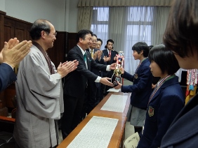 第25回全国中学校駅伝大会女子の部で優勝(4連覇)された,京都市立桂中学校陸上部女子駅伝チームが京都市役所を表敬訪問され,議長,副議長共に出席しました。