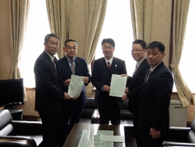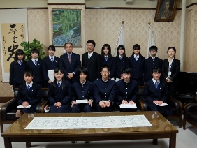 京都教育大学附属桃山中学校の生徒による京都市会への提案書提出(議長室)(寺田議長,久保副議長出席)