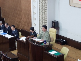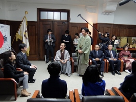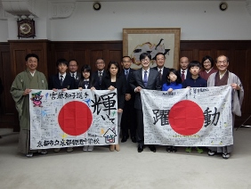 平昌オリンピックに出場される,京都市在住の宮原知子選手を激励するため,市立御所南小学校と市立京都御池中学校の生徒の皆さんが応援メッセージを寄せ書きした国旗を,同選手の御両親へ贈呈するセレモニーが開催され,議長,副議長共に出席しました。