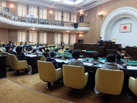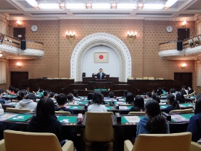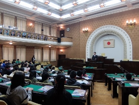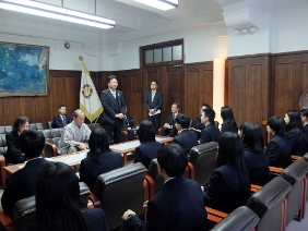 市立堀川高等学校の生徒がボストン海外研修に先立ち京都市役所を表敬訪問され,議長が出席しました。
