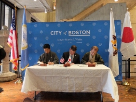 ボストン市役所では,ボストン市職員やボストン市長と意見交換を行い,両市のレジリエンスを強化し,持続可能な社会を構築するために協力すること等を誓い合い,調印が交わされました。