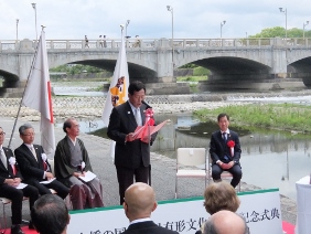 七条大橋の国の登録有形文化財登録記念式典(七条大橋西南詰 鴨川河川敷)(山本議長,青野副議長出席)