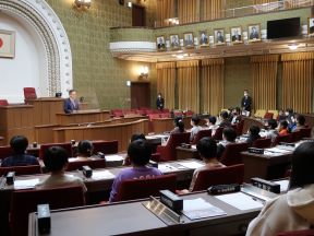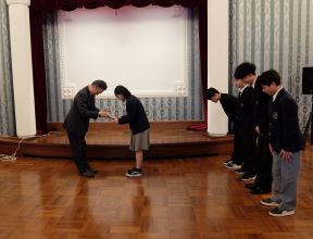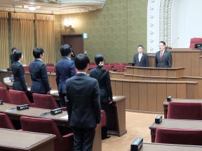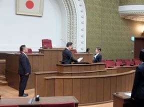 市会事務局人事異動発令式(市会議場)(田中議長、