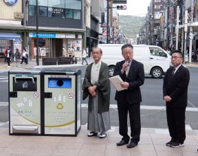 株式会社木下カンセーからのスマートごみ箱の寄付に係るお披露目式及び篤志者表彰式(河原町三条交差点西側)(田中議長、