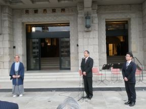 松井孝治新市長の初登庁(市庁舎前広場)(西村議長、平山副議長出席)