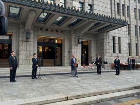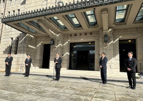 門川大作市長退庁式(市庁舎前広場)(西村議長、平山副議長出席)