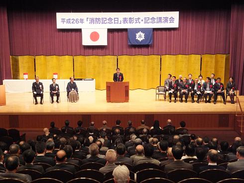 平成26年「消防記念日」表彰式が開催され,議長,副議長ともに出席しました。議長は,「自治体消防65周年記念特別功労者表彰をはじめ,栄えある表彰をお受けになられました皆様方の今日までの,たゆまぬご努力に対しまして深く敬意を表します。今後とも,地域と市民を守るリーダーとしてご活躍いただき,本市の消防・防災活動に大きなお力添えをいただきますようお願い申し上げます。」と祝辞を述べました。